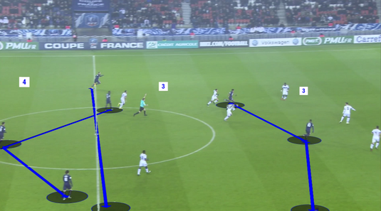 PSG evolueaza si ea intr-un 4-3-3 inca de cand Laurent Blanc se afla pe banca echipei, cu Unay Emery pe banca, gruparea franceza a pastrat sistemul dar incercand sa aiba o tranzitie-pozitiva mult mai rapida.