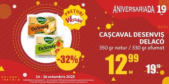 ● Caşcaval DeSenviş Delaco, 350 g natur / 330 g afumat, la doar 12,99 lei/ buc (reducere - 32%)