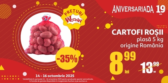 ● Cartofi roşii, plasă 5 kg, origine România, la doar 8,99 lei (reducere -35%)