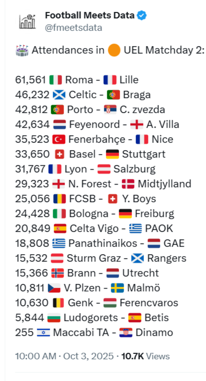 Cel mai urmărit meci din punct de vedere al prezenţei pe stadion a fost AS Roma – Lille, care a atras peste 61.000 de fani pe Stadio Olimpico. Următorul în clasament a fost duelul dintre Celtic şi Braga, desfăşurat pe Celtic Park, cu tribune aproape pline, în ciuda înfrângerii suferite de scoţieni (0-1).