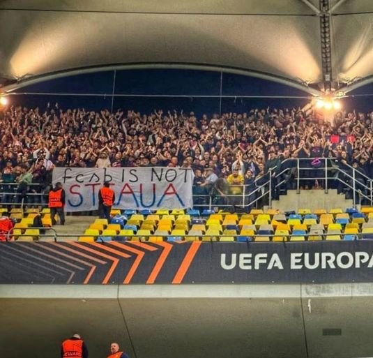 Bologna conduce cu scorul de 2-0 la pauza partidei cu FCSB din etapa a 3-a în faza principală din UEFA Europa League. Suporterii italieni veniţi la Bucureşti au afişat un banner controversat adresat campioanei României.
