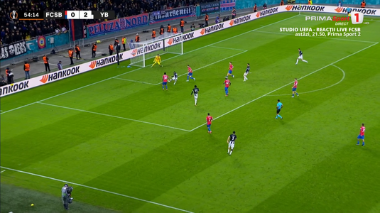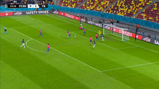 Min. 55 Târnovanu, în mare formă! YB ratează o ocazie uriaşă! Bedia şutează din interiorul careului, dar mingea este respinsă de portarul FCSB.