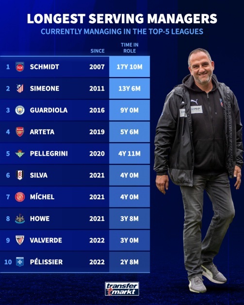 Când vine vorba despre cel mai longeviv antrenor din campionatele de top din Europa, cel mai rapid şi la îndemână răspuns este Diego Simeone, cu aproape 14 ani la al său Atletico de Madrid.